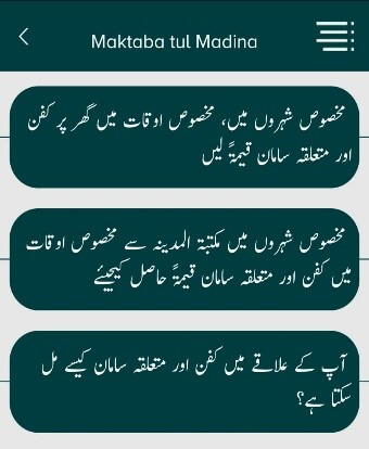 (2)مختلف شہروں میں مکتبۃ المدینہ سے کفن اور مُتعلِّقہ سامان قیمتاً حاصِل کریں۔ (اس آپشن پر کلک کرنے سے مختلف شہروں میں قائم دعوت اسلامی کے مکتبۃ المدینہ کی برانچز، ای میل اور موبائل نمبر شو ہوں گے جن کے ذریعے کفن اور اس کے مُتعلِّقہ سامان اور دیگر معلومات حاصِل کی جا سکتی ہیں۔)